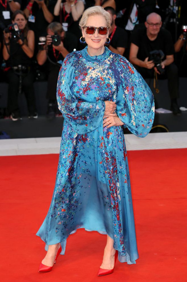 Faimoasa actriță nu ne dezamăgește niciodată când vine vorba de aparițiile pe covorul roșu. De fapt și de drept, covorul nu este suficient de roșu fără prezența lui Meryl. Și-a făcut apariția la premiera filmului ” The Laundromat”, într-o rochie de mătase colorată, semnată Givenchy. Doar o Meryl Streep ar fi putut să apară pe covor cu ochelarii de soare la ochi and she nailed it! Actrița optează întotdeauna pentru un makeup natural și o coafură lejeră, urmând regula ”less is more”.
