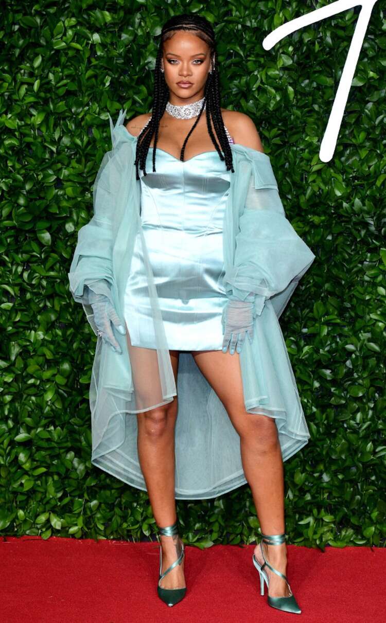 Faimoasa artistă a cucerit covorul roșu într-o apariție ce aparține propriului său brand, Fenty. A purtat o rochie scurtă, personalizată cu bretele încrustate în diamante, perfectă pentru evidențierea personalității sale efervescente. Și pentru că Rihanna va arăta întotdeauna chic în fața temperaturilor scăzute, aceasta a adăugat o haină din tul în aceeași nuanță a rochiei, la care a accesorizat o pereche de mânuși din aceeași familie cromatică. Fiind mereu adepta coafurilor ieșite din comun, a debutat în seara premiilor un stil afro format din codițe. Brandul său Fenty a câstigat premiul Urban Luxe, deci putem concluziona că Rihanna a fost o dublă câștigătoare, atât pe covorul roșu cât și pe scenă.