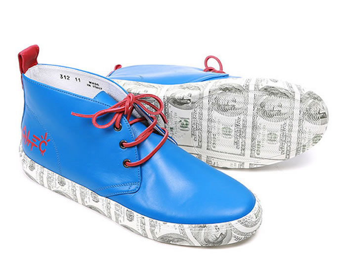 Del Toro brand gave us Emoji collection last year and this year managed to create a collaboration with Alec Monopoly, the famous graffiti artist. The new draft style pop- cultured , wanted to be a new image of the Alto Chukka ans received: nappa leather in bright blue , complete with red elements , Alec Monopoly logo placed on the heel . The shoe is imprinted with $ 1 bill and the interior comes in white leather lining. The shoes, made in Italy , will be sold only through Collette store in Paris , and then through their website colette.fr , depending on the remaining stock. Those who can not come to France to purchase the new version of Chukka, may settle for the older version, in black , which is available on deltoroshoes.com .